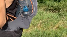 - En el tirante izquierdo tenemos un bolsillo de malla fina extensible para una soft falsk. Nosotros la usamos con una de 250 ml. Cabría una más grande, pero a nosotros nos parecía incómodo llevar más peso en el tirante.