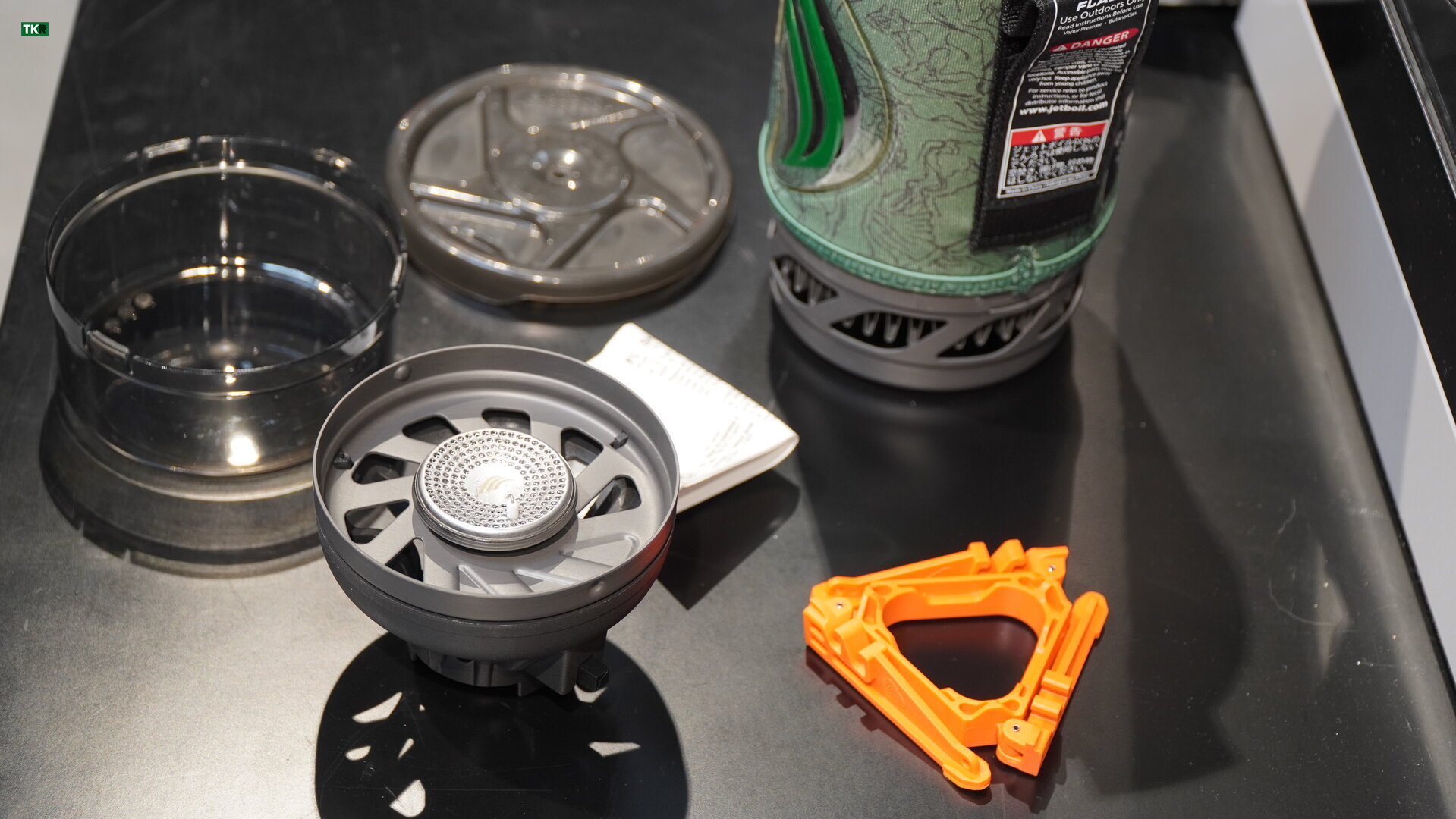 El Jetboil Flash no es simplemente un hornillo, sino un sistema completo integrado que combina quemador, recipiente y accesorios en un único conjunto compacto. Todo cabe perfectamente dentro del vaso de cocción, lo que facilita el transporte y evita que tengamos piezas sueltas en la mochila. Dentro encontramos el propio quemador, la tapa, un pequeño trípode para dar mayor estabilidad al cartucho de gas y el vaso de 1 litro con recubrimiento aislante exterior que permite manipularlo sin quemarnos.