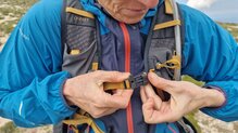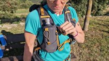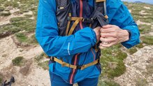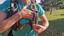 Por otro lado, y situados en las dos correas laterales de los hombros, están los dos bolsillos laterales para los bidones blandos de 500ml, estos quedan absolutamente bien fijados con las cintas flexibles estabilizadoras. La altura de las botellas nos permitió ir bebiendo mientras manteníamos el ritmo de la marcha.