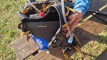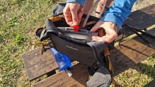 En la zona posterior de la mochila Osprey Talon Velocity 20, tenemos el bolsillo para la bolsa de agua lumbar, con la manguera que se adapta perfectamente a la mochila y queda bien sujeta en una de las asas laterales. La probamos con un contenido de 2 litros y la adaptación entre la mochila y la espalda era perfecta. Destacar que este bolsillo es exterior, que en caso de romperse la bolsa o que se sufrieran pérdidas del líquido, el contenido del interior de la mochila quedaría intacto, incluso tiene un orificio en la parte inferior para que pueda salir sin empapar el resto del tejido.