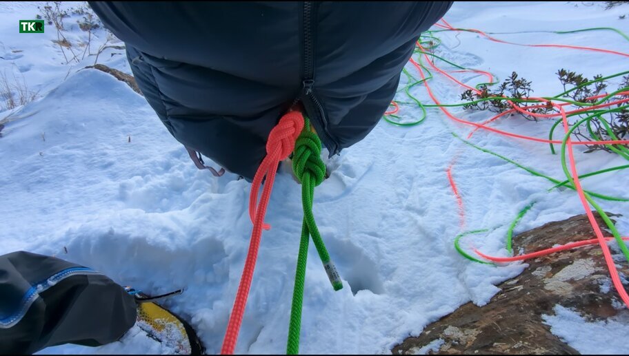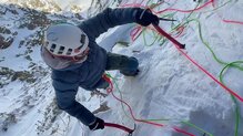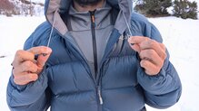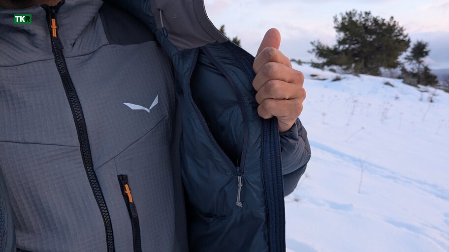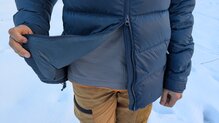 Durante nuestras pruebas en escalada en hielo, llevábamos una primera capa de lana merino, una segunda capa sintética, una chaqueta de fibra ligera, una membrana y, encima de todo, esta chaqueta de plumas. Idealmente la utilizaremos solo en las reuniones, pero en alguna ocasión también la probamos escalando el primer largo, ya que habíamos cogido frío. Aunque no es una configuración ideal —ya que tantas capas reducen la agilidad—, el tallaje está tan bien pensado que en ningún momento sentimos limitación de movimiento.