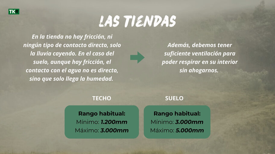 Aquí sí hay presión. Mucha, de hecho. Nuestro peso, el de la mochila y el movimiento constante dentro de la tienda hacen que el suelo sí necesite una columna de agua más alta. Por eso no es raro ver tiendas con suelo de 4000 o 5.000mm, incluso más en modelos diseñados para condiciones extremas. No olvidemos que la humedad del terreno, al actuar desde abajo y de forma constante, requiere materiales más robustos.